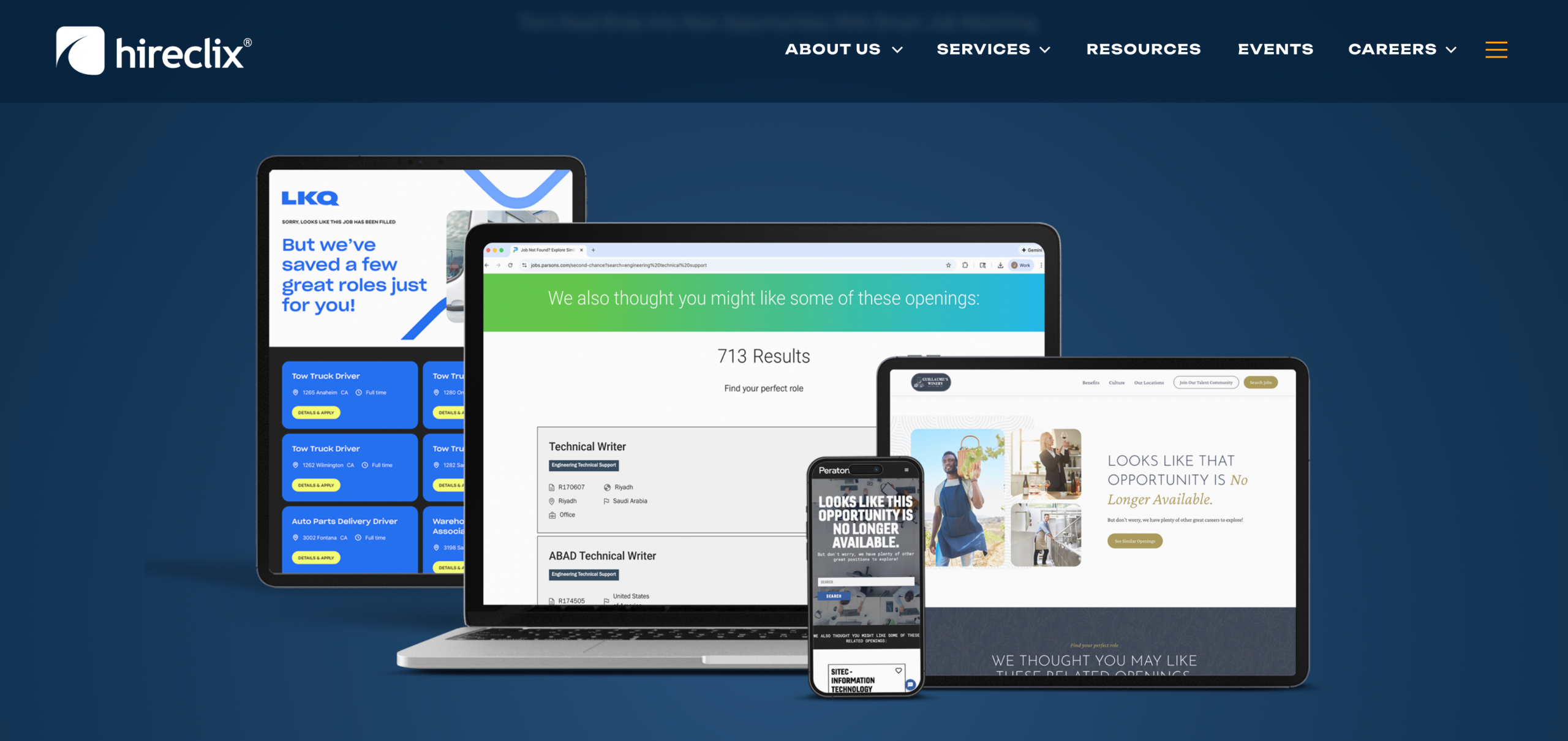 The Second Chance Pages are deployed as a part of HireClix’s enterprise career site solution. The enhancement leverages snippets of data from the original job the candidate was interested in and provides a personalized set of alternative openings, redirecting candidates to relevant open roles. HireClix’s Second Chance Pages can deliver these similar roles by adjusting the factors related to job title, job category, location, or other job details.