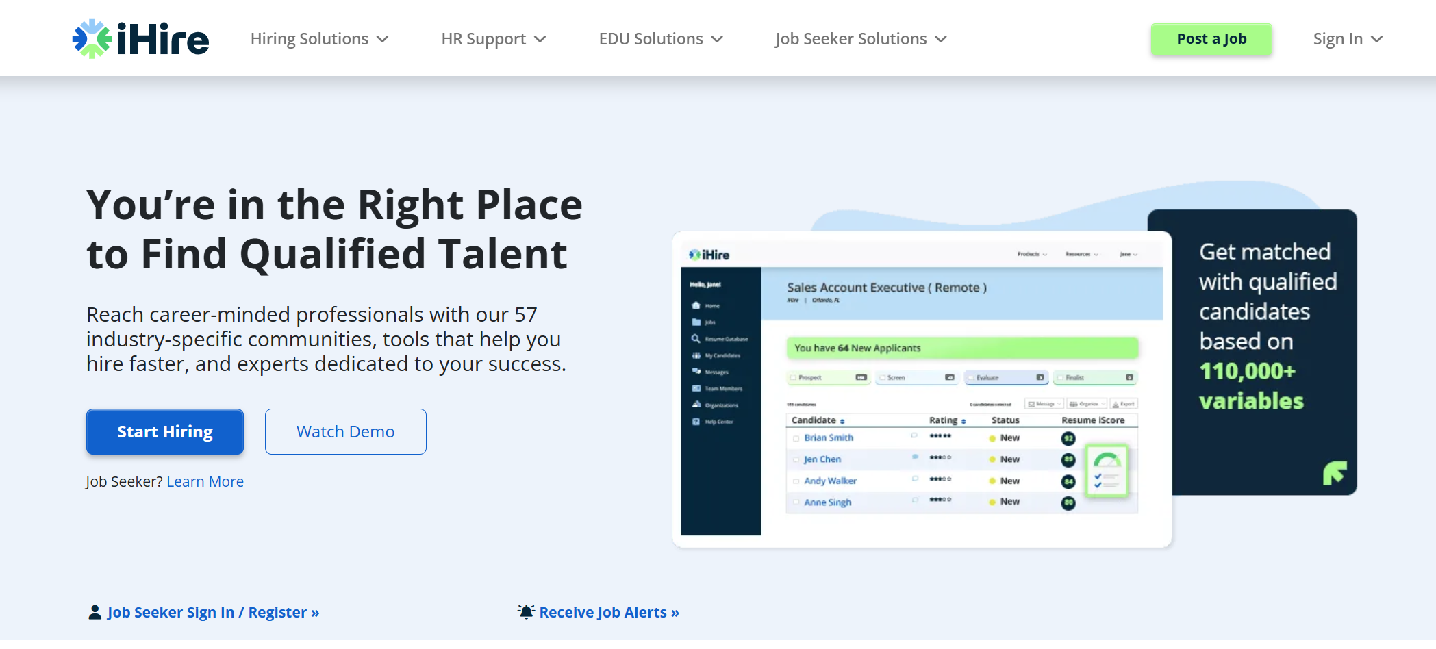 iHire is a leading employment platform that powers a family of 57 industry-focused talent networks, including WorkInSports, iHireVeterinary, iHireDental, iHireConstruction, and iHireChefs. For more than 25 years, iHire has combined advanced job matching technology with our expertise in the talent acquisition space to connect job seekers with employers in their desired sector. With an industry-specific, candidate-centric, and data-driven approach to recruitment, iHire helps candidates find meaningful work and employers find unique, high-quality talent – faster, easier, and more effectively than a general job board. Visit