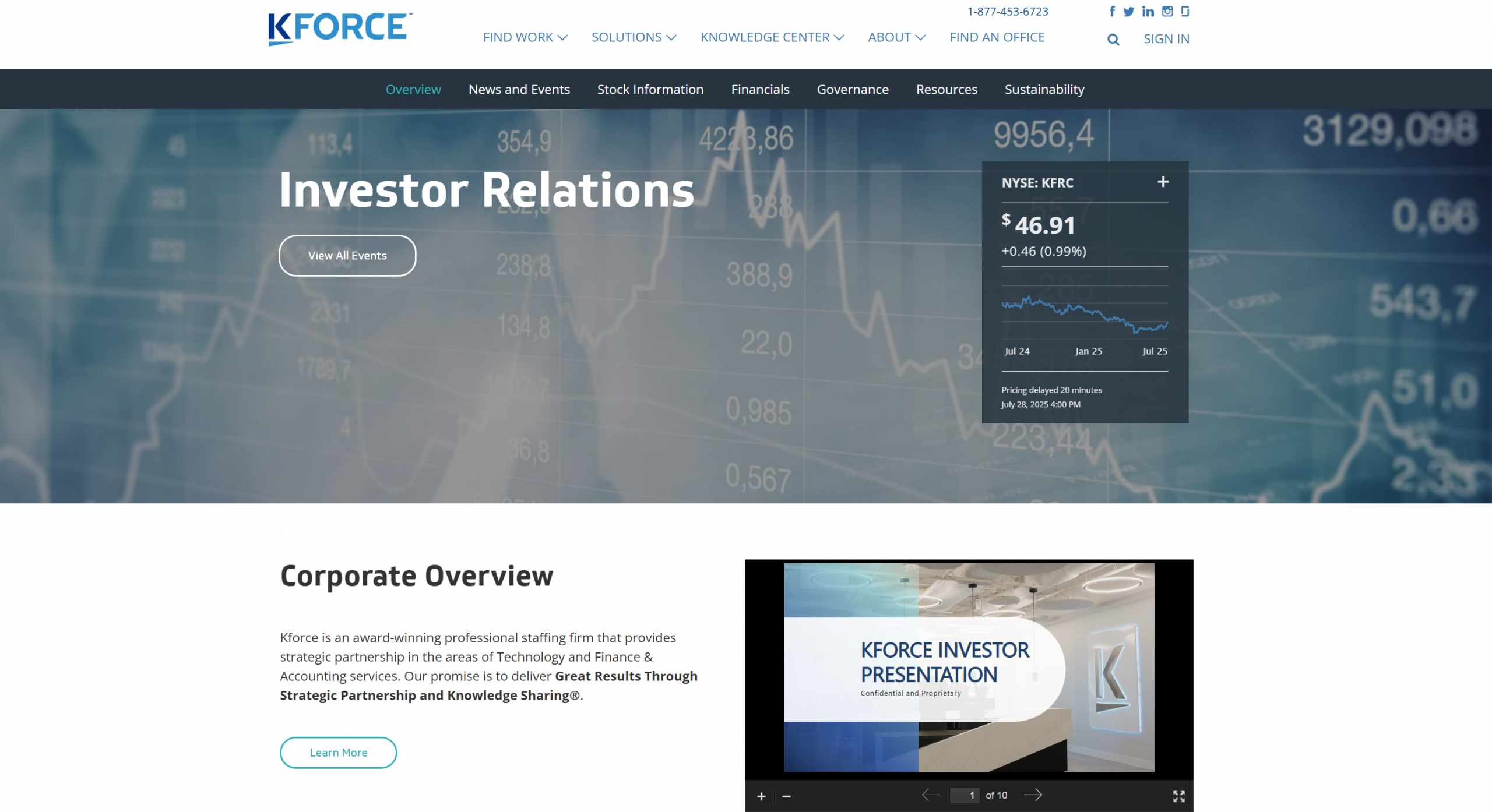 Kforce Inc. (the “Firm”) is a solutions firm specializing in technology, finance and accounting, and other professional staffing services. Our KNOWLEDGEforce® empowers industry-leading companies to achieve their digital transformation goals. We curate teams of technical experts who deliver solutions custom-tailored to each client’s needs. These scalable, flexible outcomes are shaped by deep market knowledge, thought leadership and our multi-industry expertise.