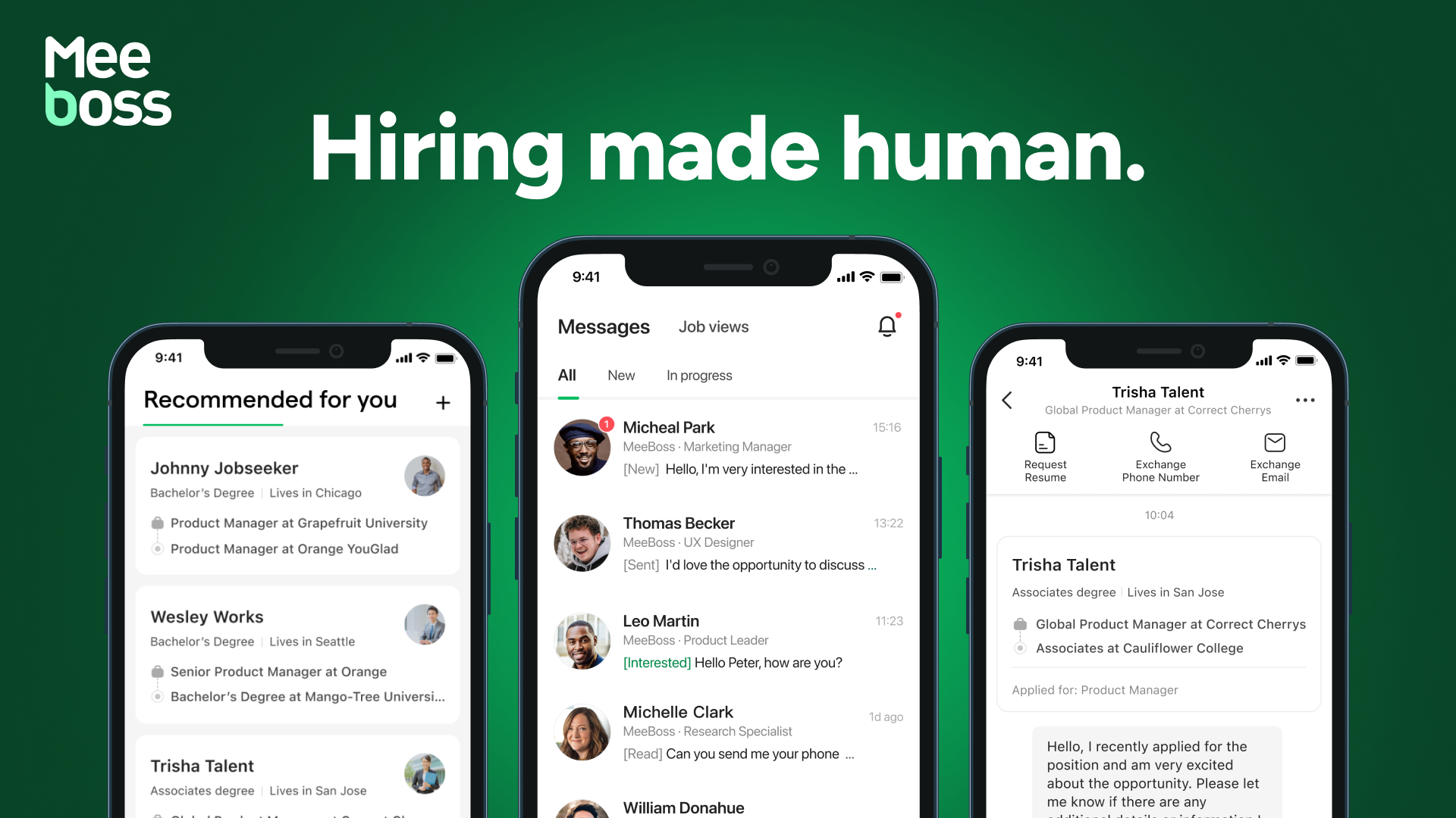 MeeBoss is a chat-first hiring platform designed to bring human connection back to recruitment. The platform enables meaningful conversations, allowing both candidates and hiring managers to ask questions and move forward in real time. Its intelligent matching engine goes beyond skills to assess culture fit and career goals, helping top candidates and hiring managers connect early, better evaluate fit, and reduce the resume blackhole and lengthy application processes. To learn more, visit https://www.meeboss.com/employer/home.