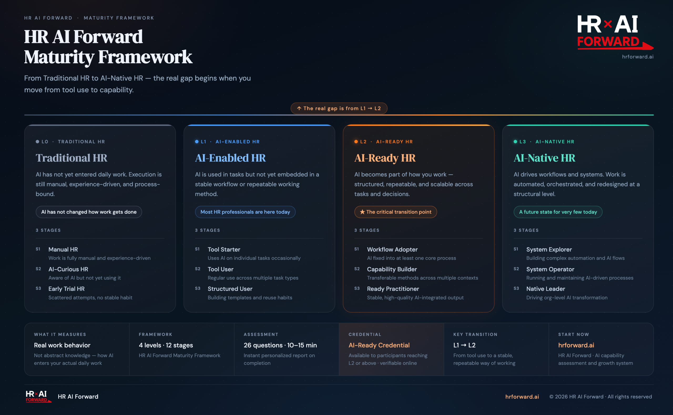 That foundation is what L2 represents. And building it is what the HR AI Forward Maturity Framework is designed to support.